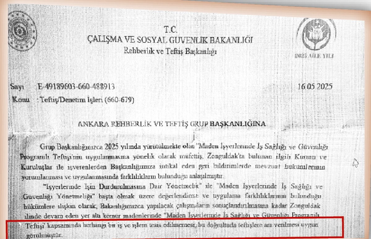 Türkiye Taşkömürü Kurumunun (TTK) Zonguldak’taki Karadon, Üzülmez ve Amasra müesseselerine bağlı kömür ocaklarında, 16 Mayıs 2025’te iş güvenliği denetimlerinin durdurulduğu ve bu tarihten bu yana denetim yapılmadığı ortaya çıktı. Müfettişlerin, üç kömür ocağı için ayrı ayrı jeneratör temin edilmeden ocaklara inilmemesi gerektiğini raporladığı, ocakların derhal kapatılarak sorunun giderilmesini istediği öğrenildi.