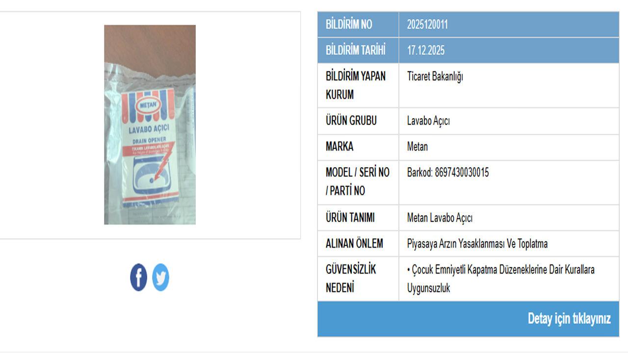 Yapılan denetimler sonucunda, Metan markasına ait bir lavabo açıcı ürünün kullanımının insan sağlığı için risk barındırdığı belirlendi. Bakanlık tarafından yapılan açıklamada, ürünün çocuk emniyetli kapatma sistemlerine ilişkin mevzuata uygun olmadığı ifade edildi.