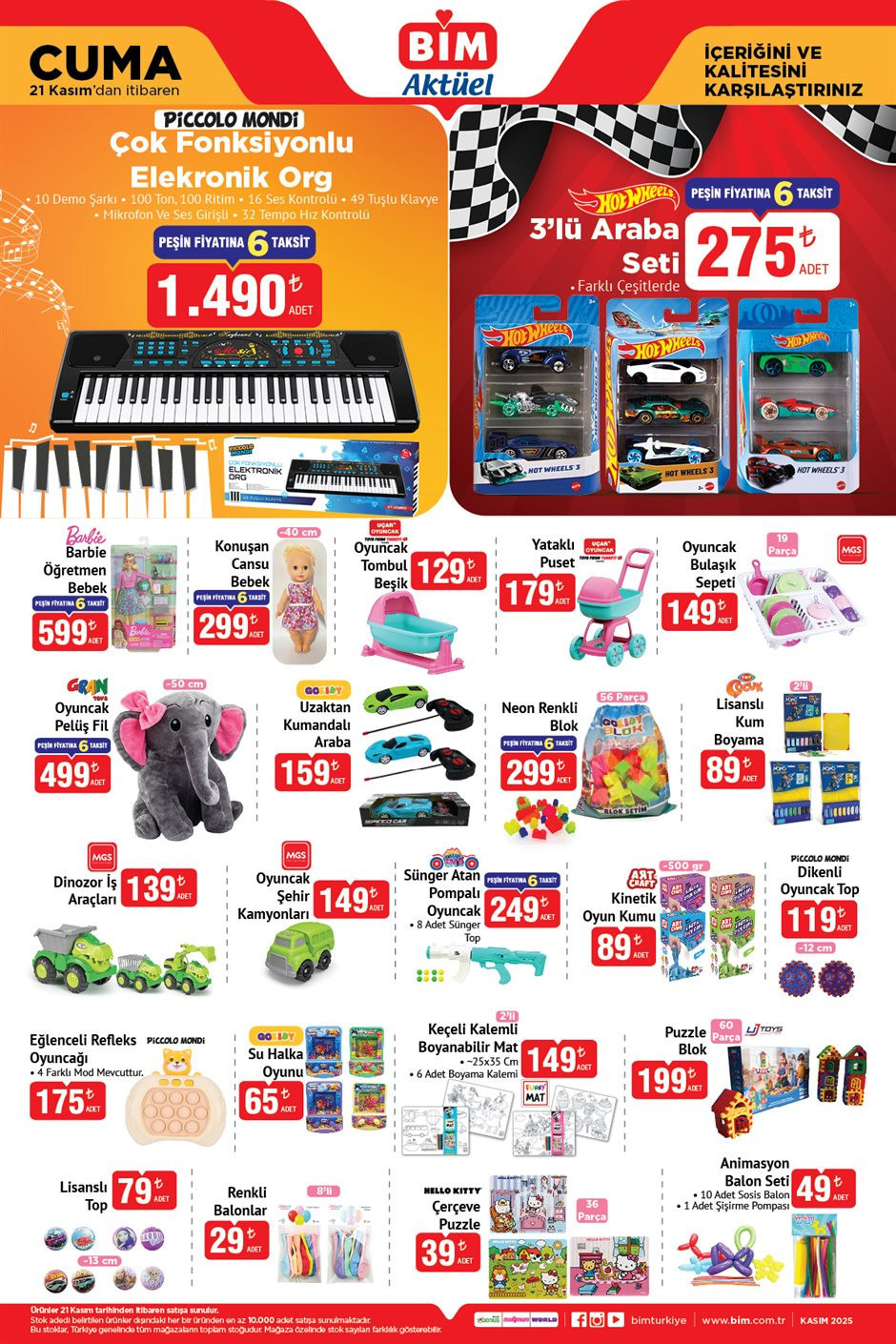 Bim aktüel ürünler 18-21 Kasım 2025 kataloğu yayımlandı. Bu hafta bim aktüel 21 Kasım 2025 kataloğu içerisinde; Çok Fonksiyonlu Elektronik Org 1.490 TL 3’lü Araba Seti 275 TL, Oyuncak Bulaşık Sepeti 149 TL, Yataklı Puset 179 TL, Oyuncak Tombul Beşik 129 TL, Konuşan Cansu Bebek 299 TL, Barbie Öğretmen Bebek 599 TL ‘den raflarda ve bim online alışveriş sitesi bim.com.tr’de hazır bekliyor. Peki, bim’de bu hafta cuma neler var? İşte, Bim aktüel 18-21 Kasım 2025 kataloğu tamamı…